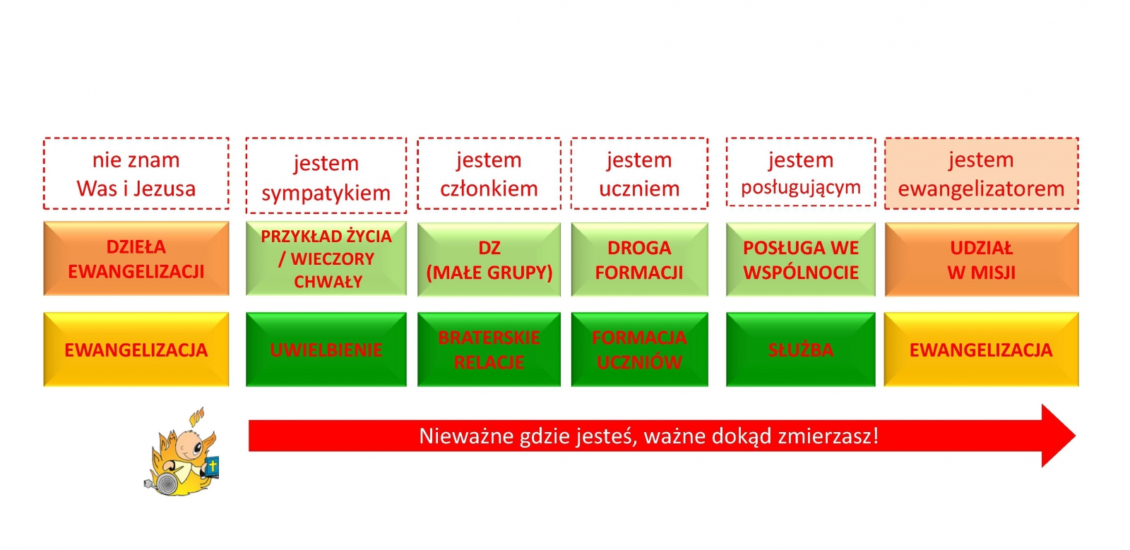 Droga we Wspólnocie prowadzi każdego z nas poprzez wypełnianie 5 biblijnych celów - od osoby, która jest ewangelizowana, do osoby, która staje się uczniem i przyjacielem Jezusa oraz radosnym ewangelizatorem.